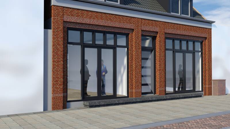 Het pand is volledig vernieuwd, alleen de bouwmuren tot de eerste verdiepingsvloeren en de fundering zijn behouden. Maar wat voegt het zich mooi in deze levendige straat. Alleen om het hoogteverschil met de straat op te lossen hebben we stoepen bedacht en die gaan we na de bouwvak aanleggen.